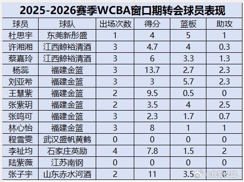 其他球队的新援也各有亮点:江西鲸裕清酒的新援虽在进攻端还有待调整,但许湘湘和蔡嘉玲场均分别4个和3.3个篮板,也为球队内线增加了厚度;石家庄英励的李祉均快速融入球队,4次出场交出场均7.8分1.5篮板外加2助攻的稳定答卷,成为后场重要补充;东莞新彤盛的杜思宇、武汉盛帆黄鹤的程雪雯和江苏南钢的陆紫微还暂未获得较多的出场机会,有待解锁更多赛场时刻。