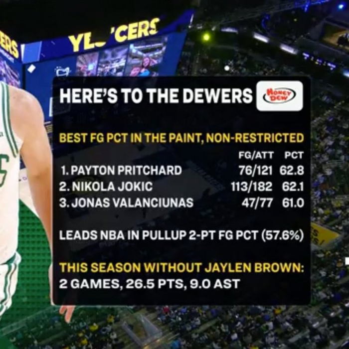 本赛季杰伦·布朗缺阵的两场比赛,普里查德场均26.5分9.0助攻。