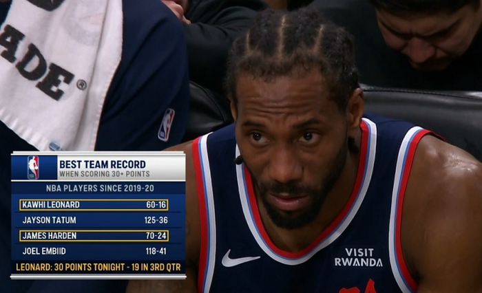 球员单场得分30+球队战绩:伦纳德带队60胜16负 哈登带队70胜24负