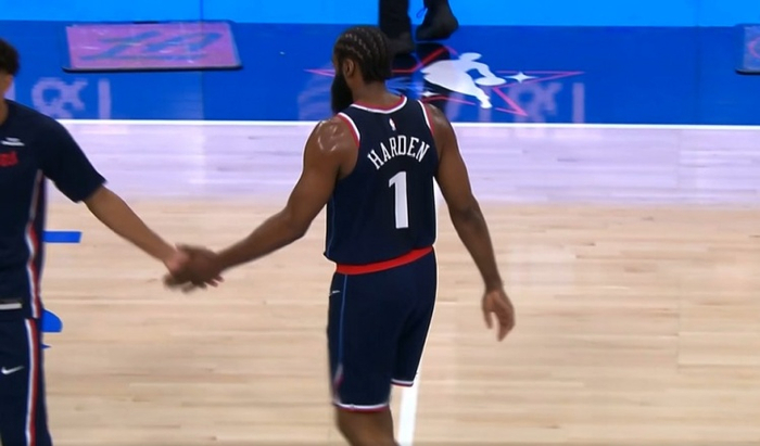 还是得看你!哈登强突挤过防守 左手上篮压哨命中!