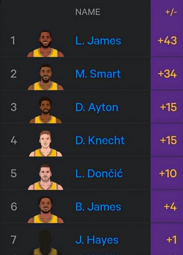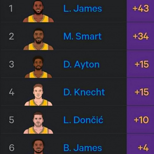 2026年湖人球员累计正负值:詹姆斯+43第1 斯玛特第2 东契奇第5