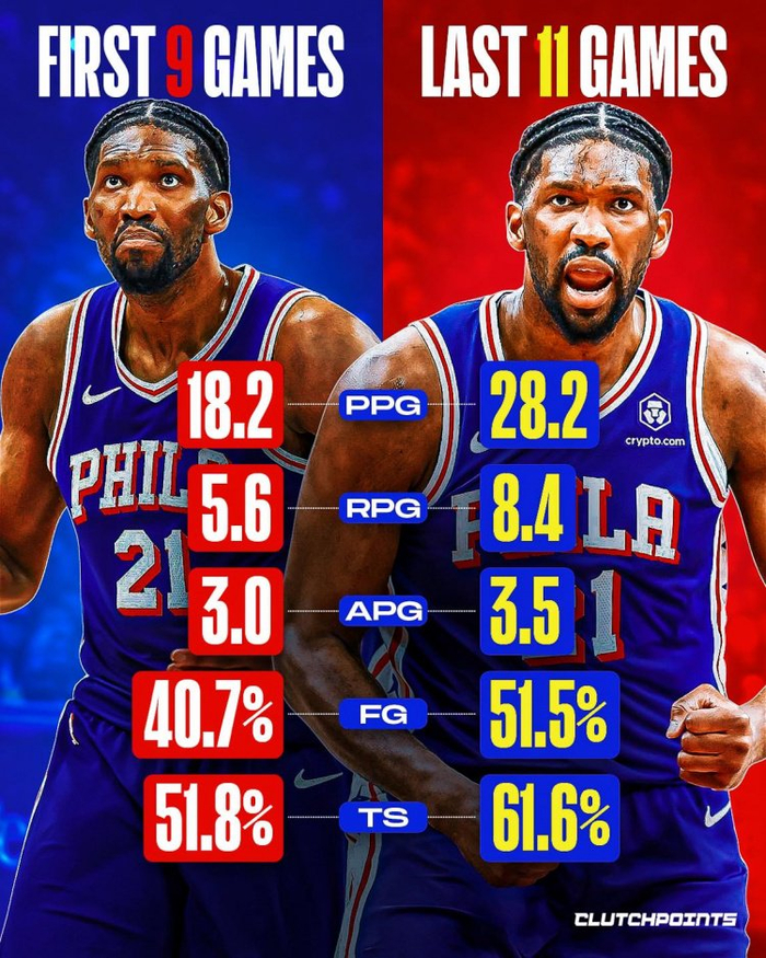 越打越好!恩比德前9场仅18+5!近11场28+8 命中率提升一成!