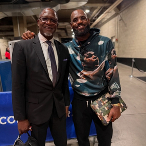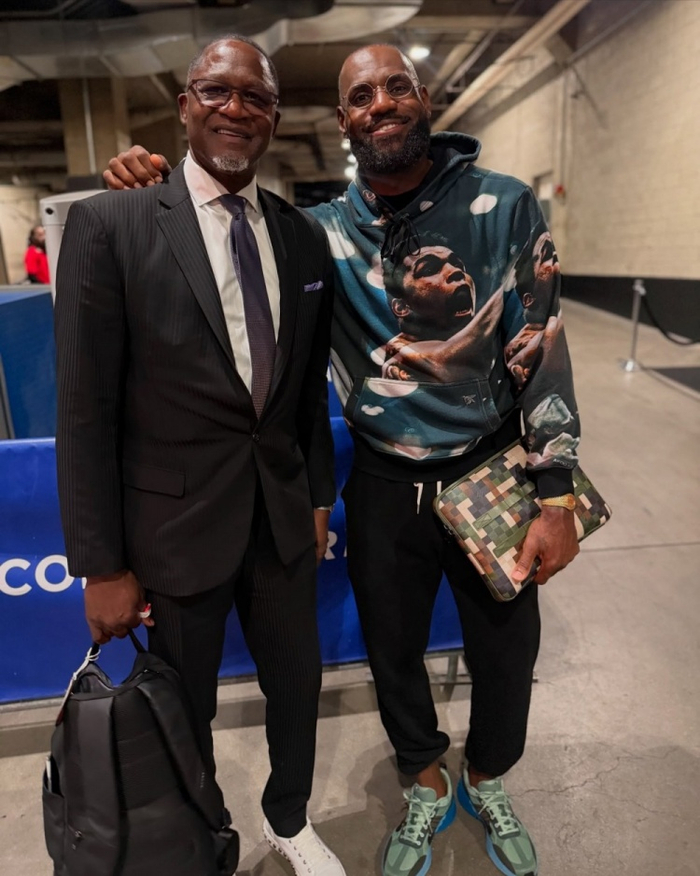 赛后,随队来到洛杉矶的老鹰名宿、现任球队篮球事务副总裁威尔金斯也和詹姆斯打了照面。他还晒出了两人的合照,并配文:“比赛后和你聊上几句真的很开心,总是很享受这种轻松交流的时刻。”