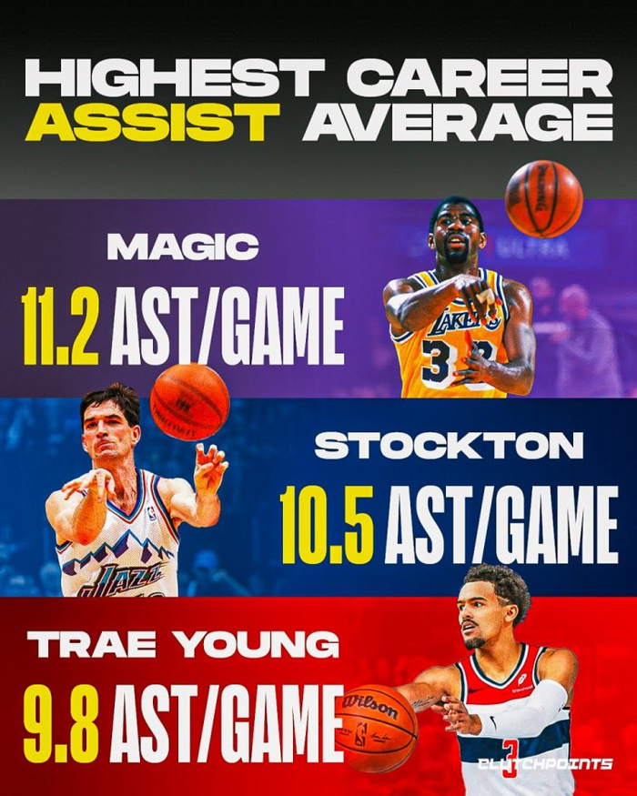 特雷·杨生涯场均助攻9.8次 排历史第3!前2为魔术师&斯托克顿!