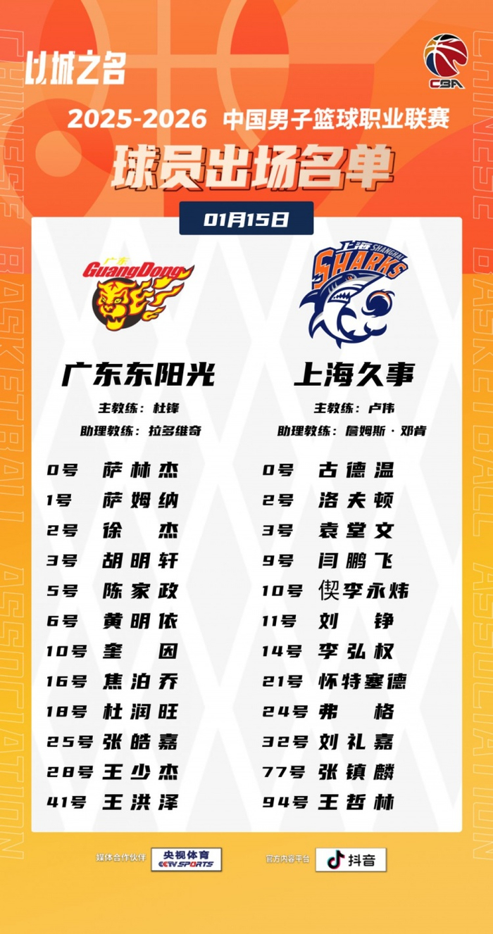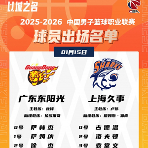 直播吧1月15日讯 今晚19:35,广东将在主场迎战上海,赛前大名单出炉。