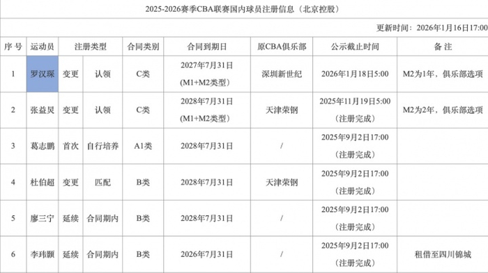 直播吧01月16日讯 CBA官网更新国内球员注册信息,罗汉琛与北控男篮C类合同签约2年,第2年为球队选项。