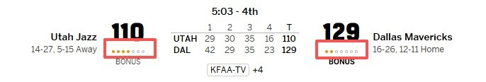有意思的是,距终场还有5分03秒,爵士落后19分,但他们还有4个暂停;相反独行侠仅剩2暂停。