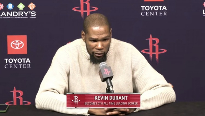 直播吧1月19日讯 火箭今日主场119-110轻取鹈鹕,杜兰特荣升NBA历史得分榜第六,赛后接受了媒体采访。
