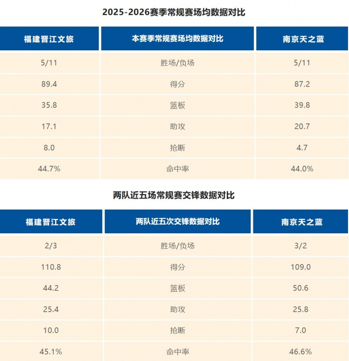 福建晋江文旅男篮与南京天之蓝男篮历史上一共交手22次,福建晋江文旅男篮12胜10负。上赛季两队交手2次,福建晋江文旅男篮1胜1负。