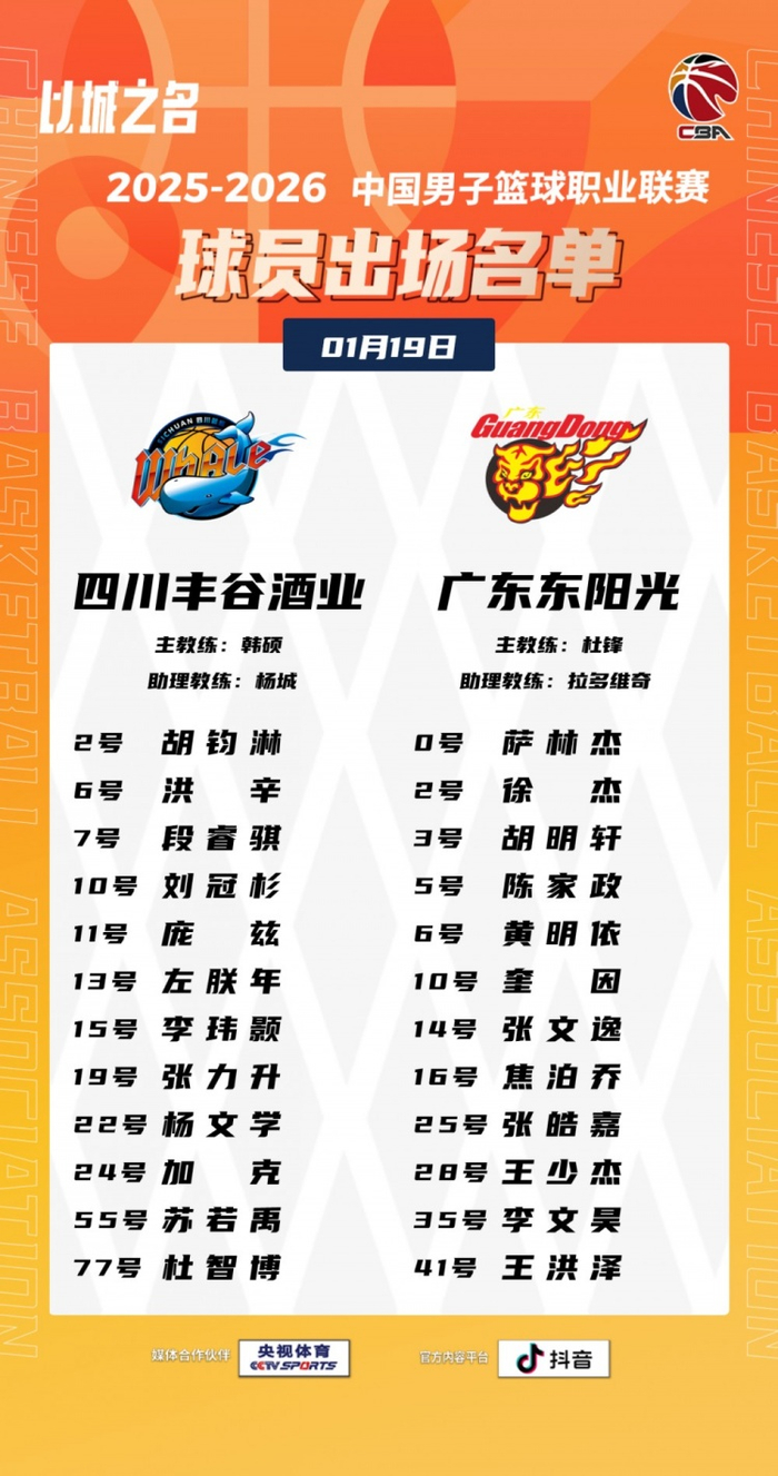 直播吧1月19日讯 今晚19:35,四川将在主场迎战广东,赛前大名单出炉。