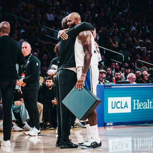 詹姆斯转发了一张赛场照,展示了他在昨日击败猛龙比赛最后时刻下场休息时,一手队友里夫斯拥抱,一手拿着自己的坐垫。