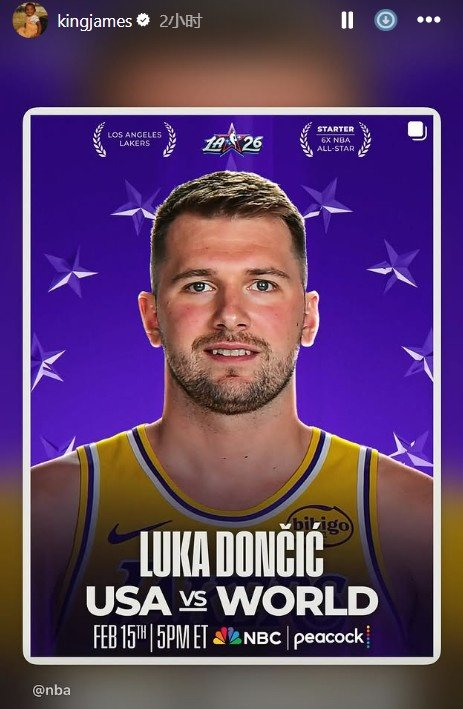 自己连续21年入选纪录终结!詹姆斯转发东契奇全明星首发海报