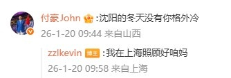 下方评论区,张镇麟晒出上海下雪照,并与前队友付豪进行互动。