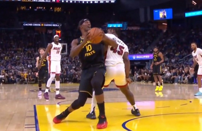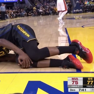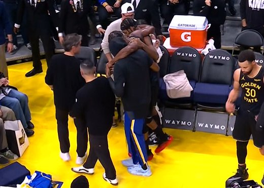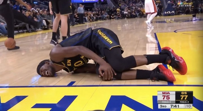 第三节还剩下7分多钟时,勇士进攻回合,吉米·巴特勒接应波杰姆斯基传球,在对抗中倒地不起,捂着右膝,表情痛苦,随后被队友希尔德和库明加架着回更衣室。