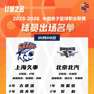 直播吧1月20日讯 19:35上海将在主场迎战北京,赛前大名单出炉。