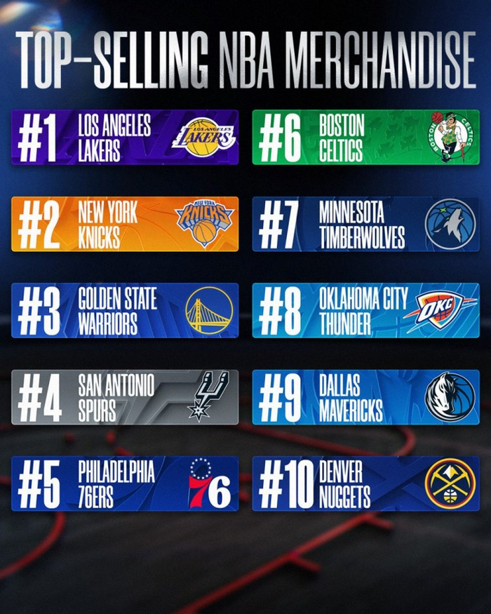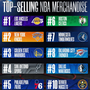 上半赛季球队球衣销量!湖人尼克斯勇士前3 马刺第4 雷霆第8