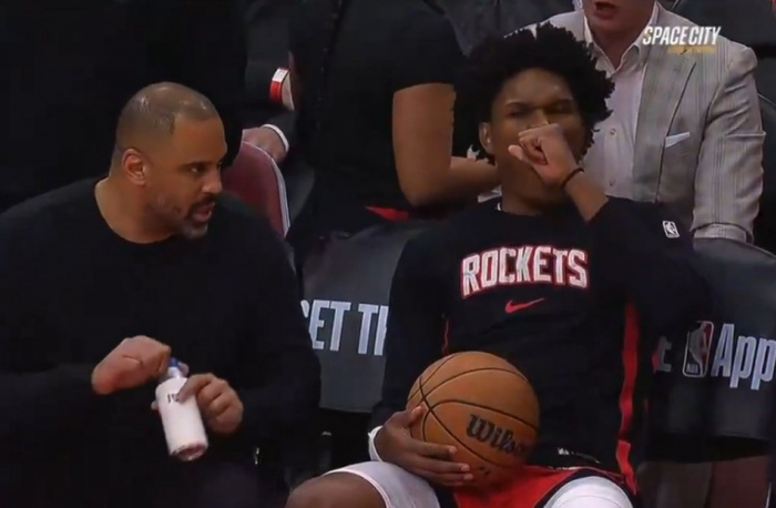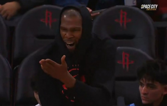 等得挺无聊~火箭VS马刺调整篮筐跳球推迟 KD、阿门都在场边打哈欠