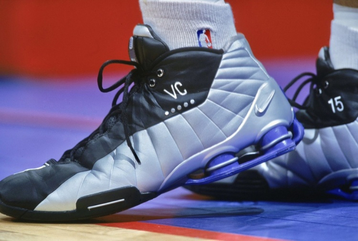卡特当年穿着的是带有个人姓名号码“VC+15”缩写的银黑色PE款。库里穿着的应该是近些年的复刻款。