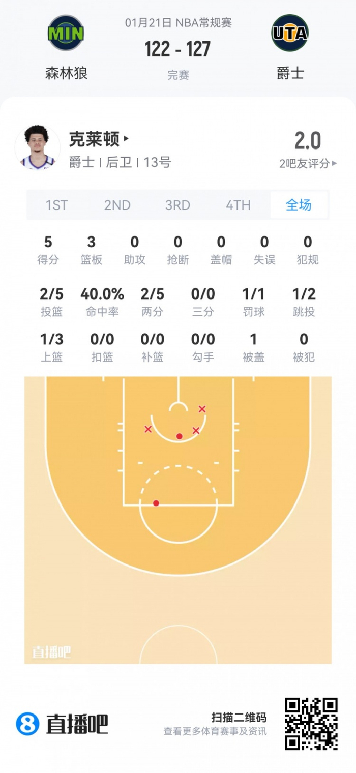爵士首轮18号秀克莱顿 登场13.5分钟