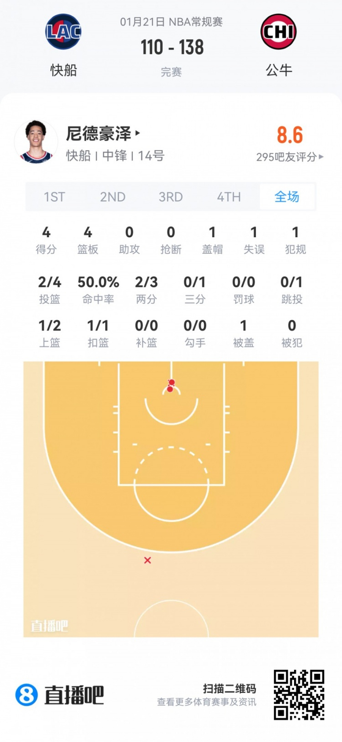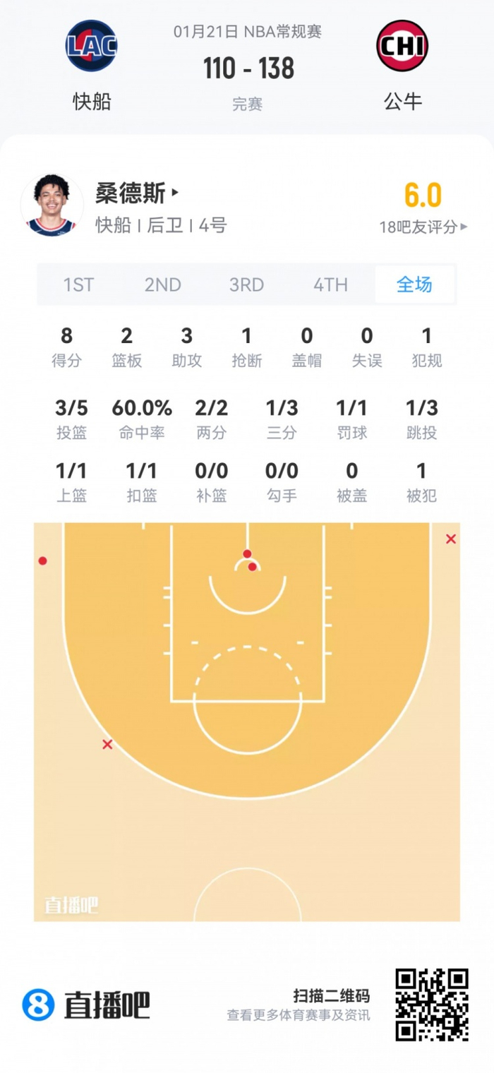 快船次轮50号秀科比·桑德斯 登场25分钟