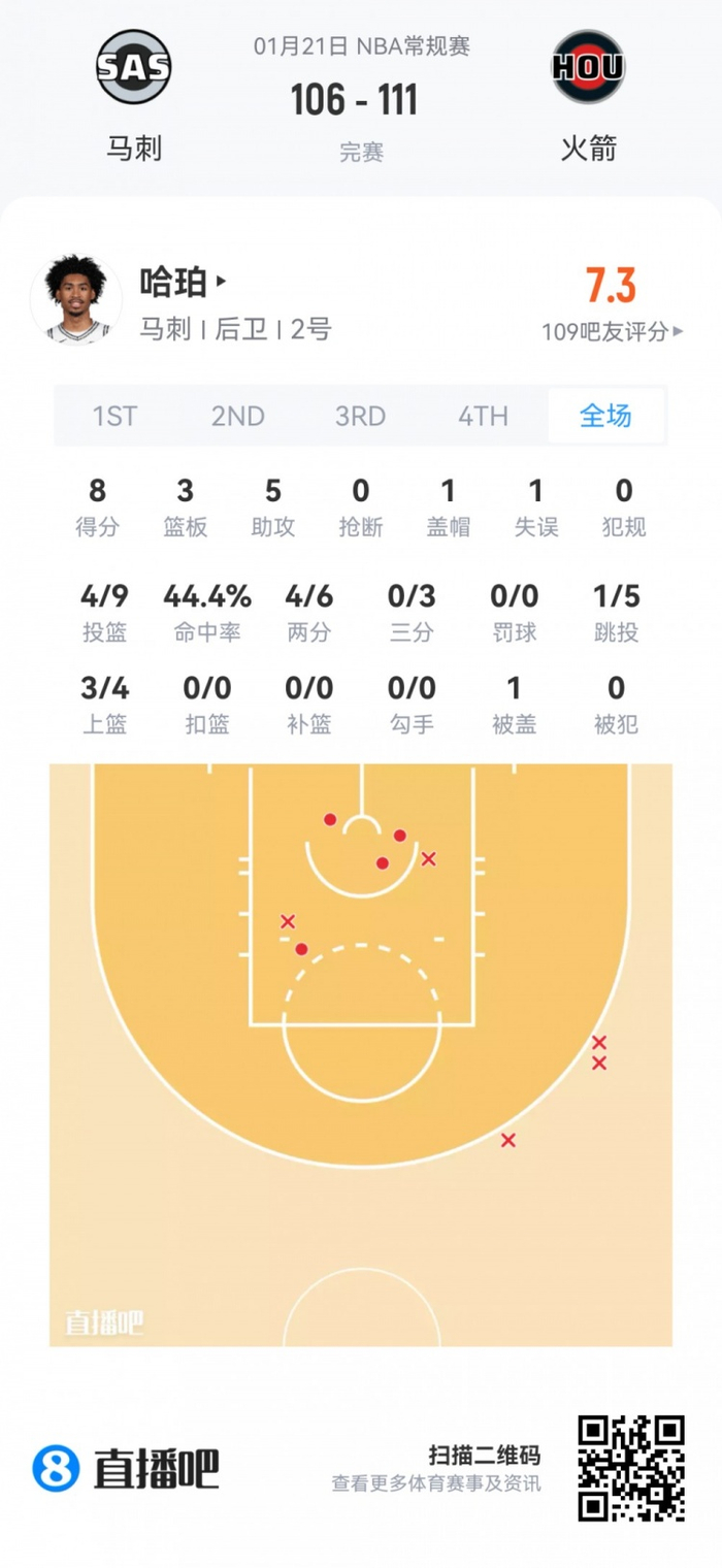 马刺首轮14号秀卡特·布莱恩特 登场10.7分钟