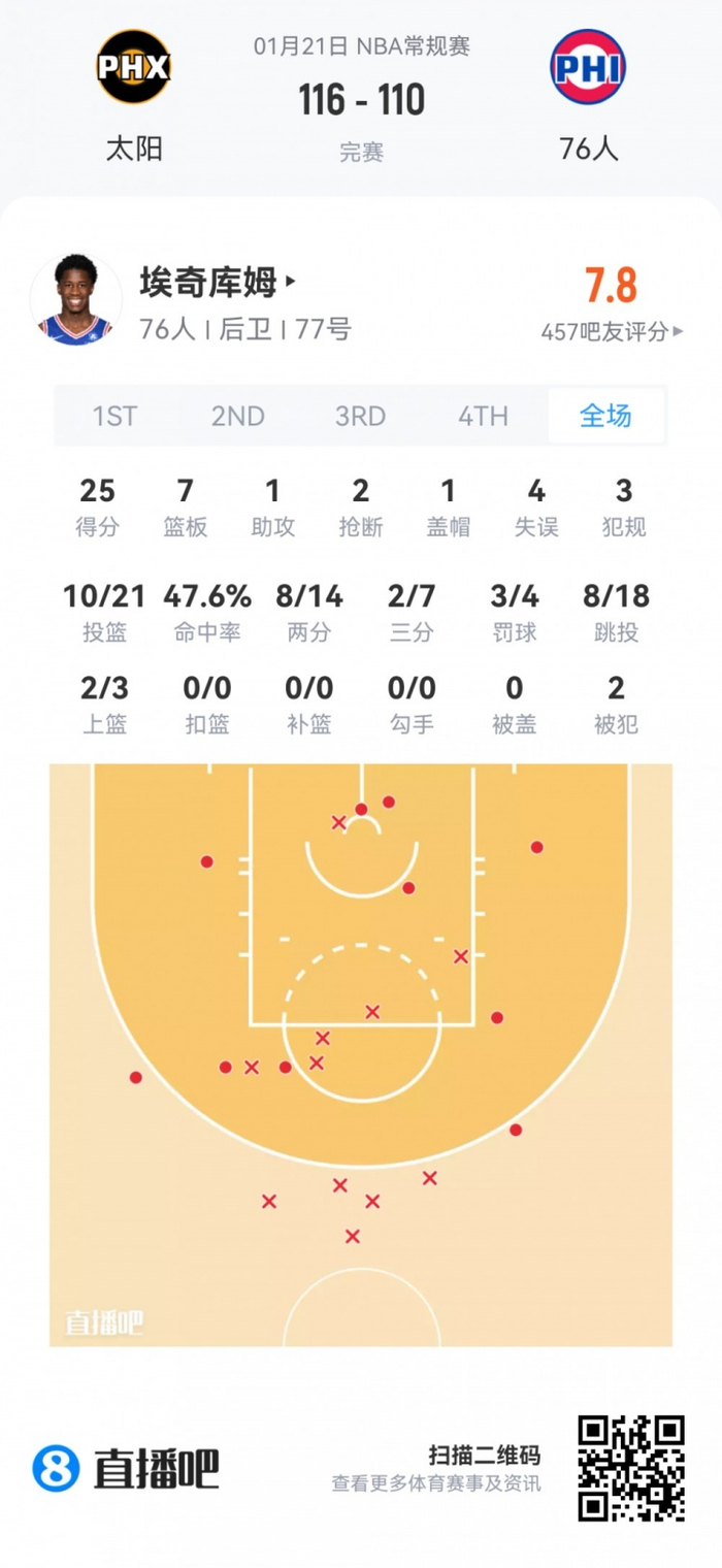 【菜鸟】埃奇库姆25分7板 贝利17中8得20分5板 哈珀8分3板5助
