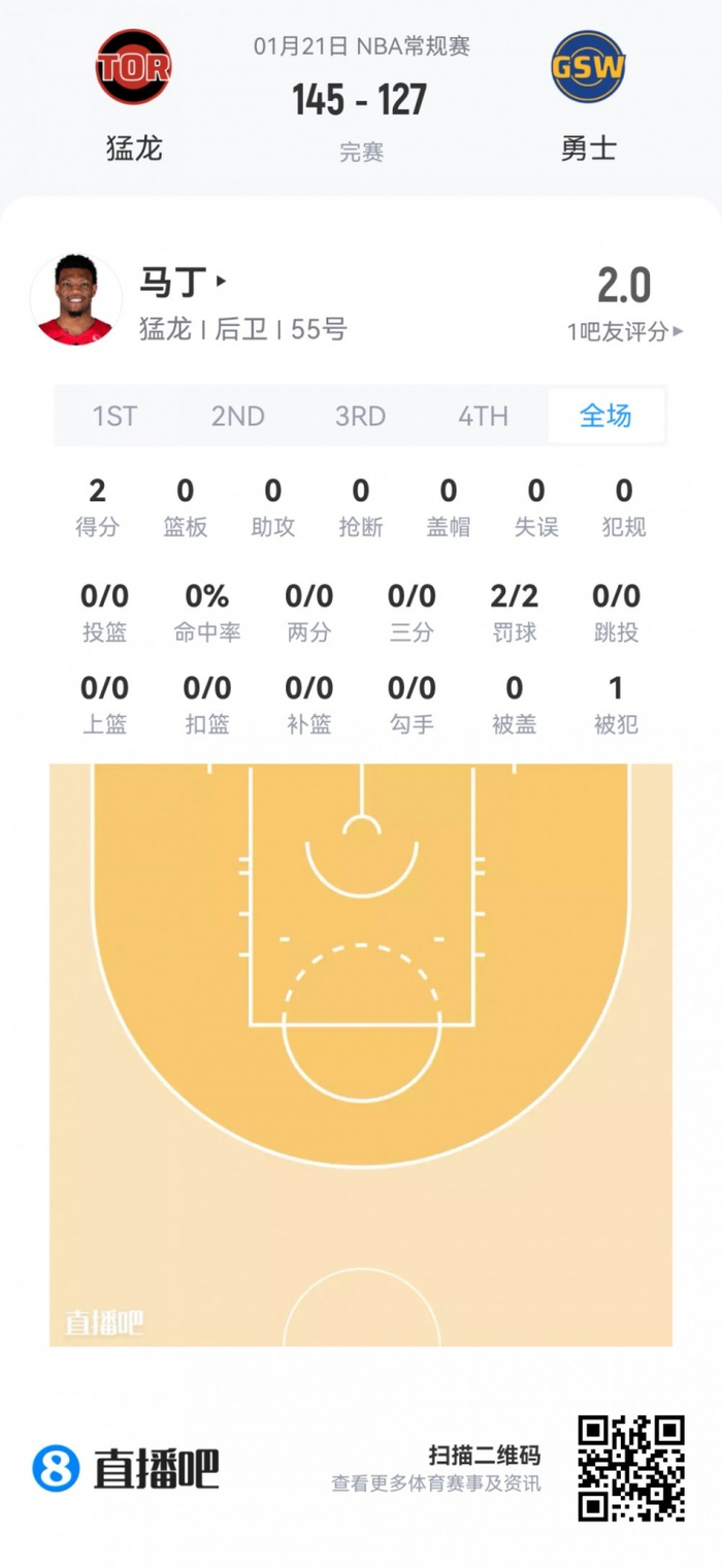 猛龙次轮39号秀阿利贾·马丁 登场1.7分钟