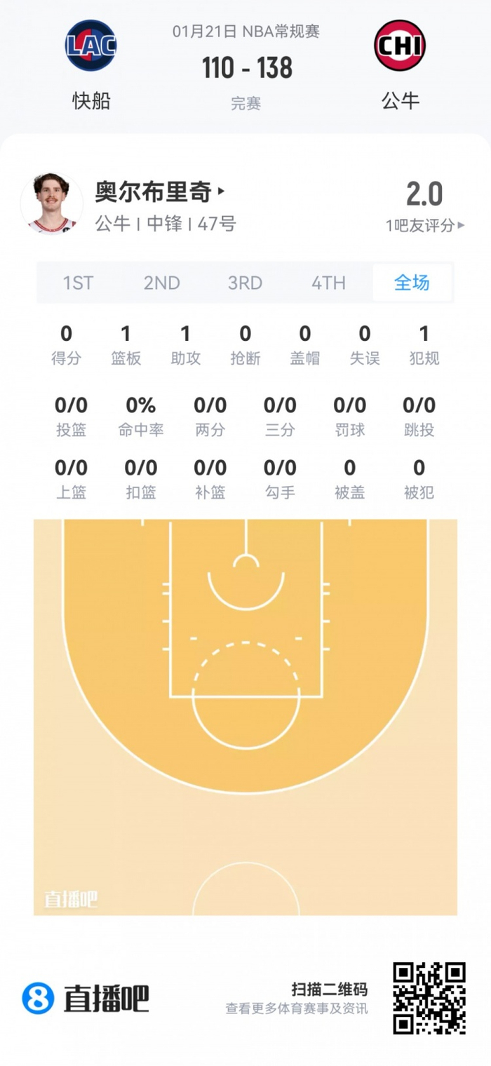 公牛次轮55号秀奥尔布里奇 登场3.7分钟