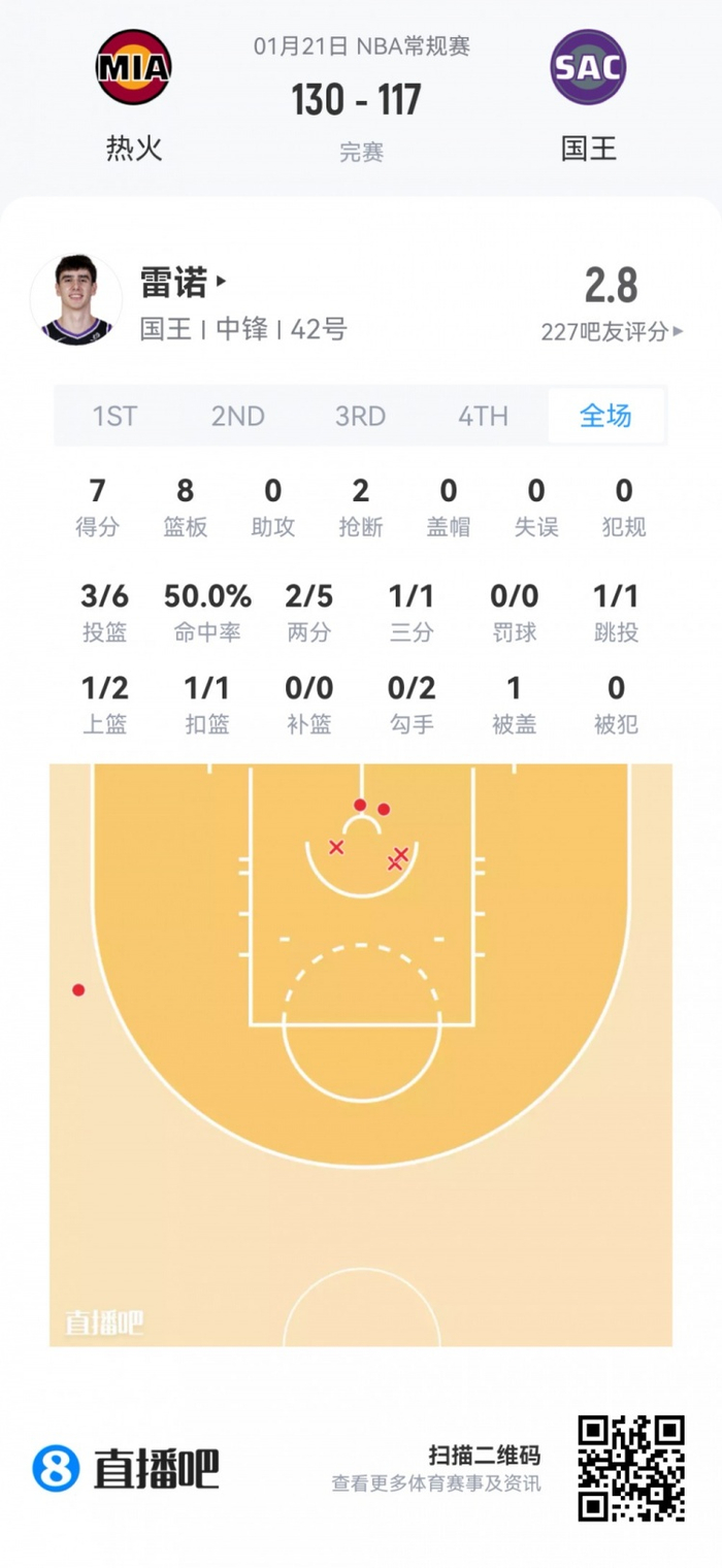 国王次轮42号秀马克西姆·雷诺 登场17.8分钟