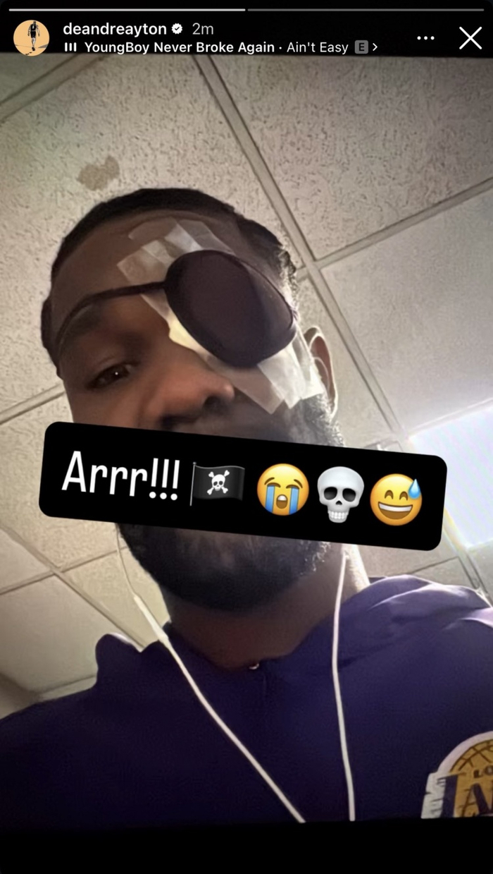 艾顿本场比赛第二节遭遇对手击打面部后左眼受伤退出比赛。艾顿晒出了自己左眼被包扎后戴上眼罩保护的自拍,并写道:“啊!!!🏴☠️😭💀😅”