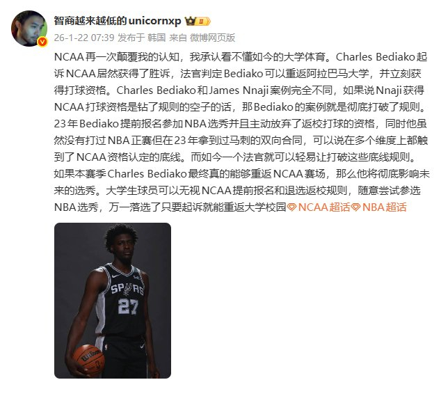 NCAA再一次颠覆我的认知,我承认看不懂如今的大学体育。Charles Bediako起诉NCAA居然获得了胜诉,法官判定Bediako可以重返阿拉巴马大学,并立刻获得打球资格。Charles Bediako和James Nnaji案例完全不同,如果说Nnaji获得NCAA打球资格是钻了规则的空子的话,那Bediako的案例就是彻底打破了规则。23年Bediako提前报名参加NBA选秀并且主动放弃了返校打球的资格,同时他虽然没有打过NBA正赛但在23年拿到过马刺的双向合同,可以说在多个维度上都触到了NCAA资格认定的底线。而如今一个法官就可以轻易让打破这些底线规则。如果本赛季Charles Bediako最终真的能够重返NCAA赛场,那么他将彻底影响未来的选秀。大学生球员可以无视NCAA提前报名和退选返校规则,随意尝试参选NBA选秀,万一落选了只要起诉就能重返大学校园。