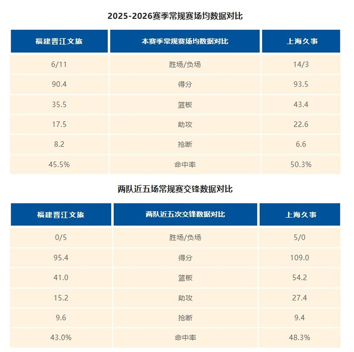 2025-2026赛季CBA联赛截止上一轮,主队福建晋江文旅场均交出90.4分35.5篮板17.5助攻的成绩单,三分命中率与罚球命中率略胜对手,同时主队场均8.2次抢断位列联盟前列,失误控制以场均11.1次优于上海久事男篮的12.9次。上轮击败南京天之篮男篮的比赛中,主队五人得分上双,团队进攻火力正逐步释放。反观本轮对手上海久事男篮,前十七轮取得联盟顶尖的攻防数据,场均93.5分的进攻输出更胜主队,79.2分的场均失分展现联盟顶级防守水准,50.3%的投篮命中率、43.4个篮板和22.6次助攻均大幅领先主队,4.9次场均盖帽的内线护框能力也远在主队3.2次之上,阵容深度和整体攻防效率占据明显优势。