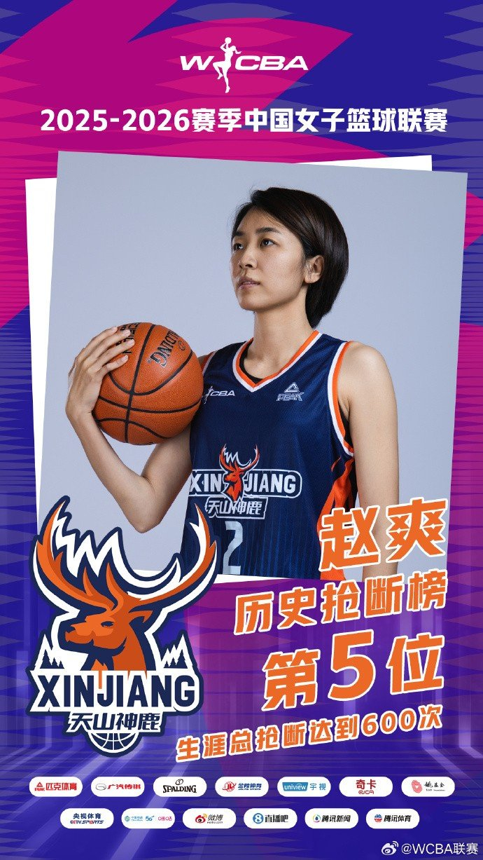 1月21日,新疆女篮老将赵爽全场贡献3次抢断,WCBA生涯总抢断次数达到了601次,成为第5位生涯抢断次数超过600次的球员!
