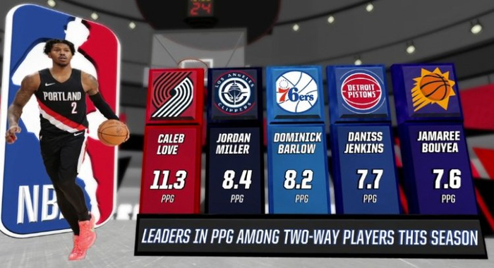 开拓者主场迎战猛龙,转播方给出一项数据统计,本赛季双向合同球员场均得分前五: