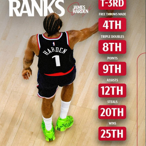 直播吧1月25日讯 今天,快船官方晒出哈登生涯各项数据的历史排名,详情如下: