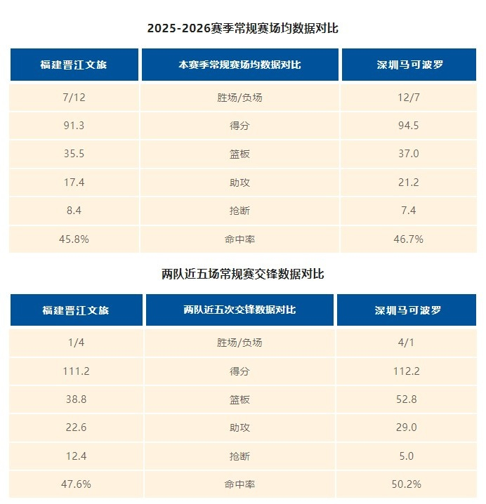 2025-2026赛季CBA第二十轮,福建晋江文旅男篮客场挑战深圳马可波罗男篮。攻防数据上,主队福建晋江文旅男篮场均得分91.3分排名联赛第六,场均失分93.4排名联赛第十五,三分命中率35.3%、场均送出17.4次助攻,以8.4次场均抢断展现出不俗的防守反击能力;深圳马可波罗男篮场均得分93.9分位列联赛第二,外线表现更为亮眼,三分命中率36.7%、场均命中11.2记三分,排名联赛榜首,场均21.3次助攻的串联能力更胜主队一筹,但在防守端,深圳男篮场均94.3的失分稍逊主队。