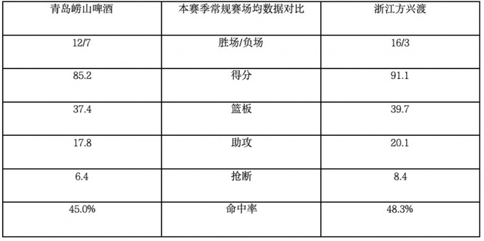 青岛崂山啤酒在与浙江方兴渡的历史交锋中处于下风,上赛季常规赛两战皆负,季后赛5次交手,青岛崂山啤酒2胜3负。