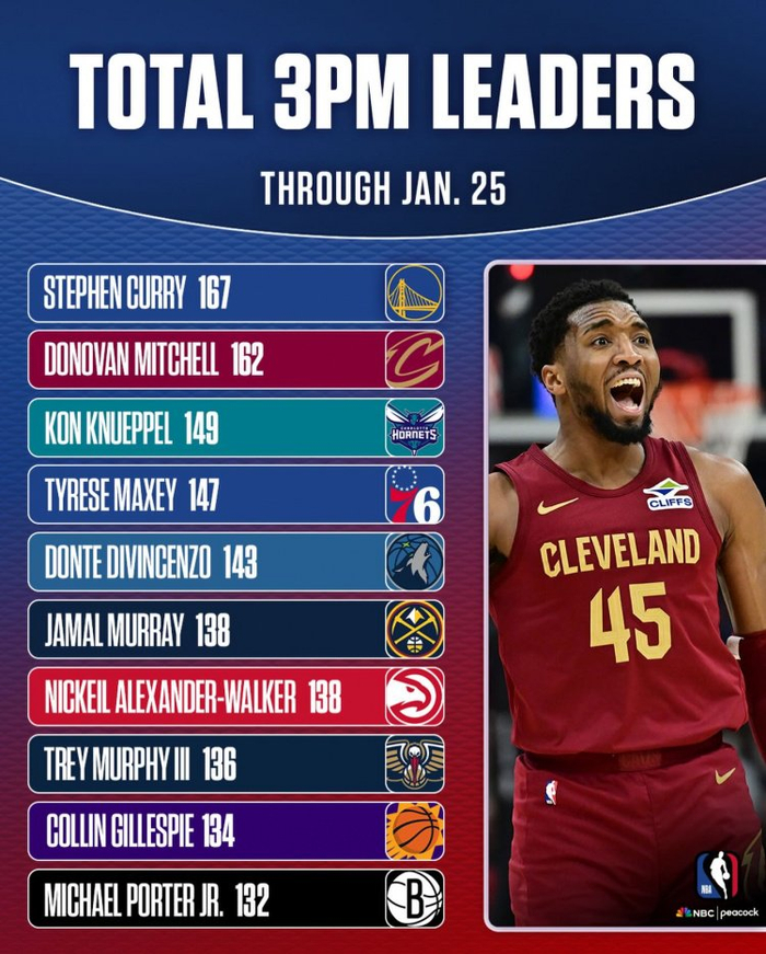 直播吧1月27日讯 NBC晒出了赛季至今的球员三分命中数排行榜。其中库里排名第一、米切尔第二、克尼佩尔第三。