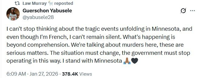 亚布塞莱写道:“我无法停止思考明尼苏达州发生的悲惨事件,尽管我是法国人,但我不能保持沉默。正在发生的一切令人难以置信。我们谈论的是谋杀,这是非常严重的事情。这种情况必须改变,政府必须停止以这种方式运作。我与明尼苏达州人民同在🙏🏾🖤”