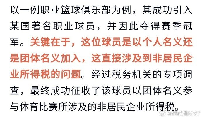 原文写道:“东莞税务局发布信息,广东宏远篮球俱乐部欠税145.8万元,欠税税种是个人所得税。这应该是给本土球员发薪的应缴税款,而CBA外援发薪涉及更多是非居民企业所得税。 当前的民企俱乐部都不容易,且看且珍惜。”