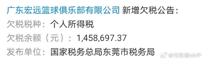 媒体人:广东宏远篮球俱乐部欠税145.8万元 欠税税种是个人所得税