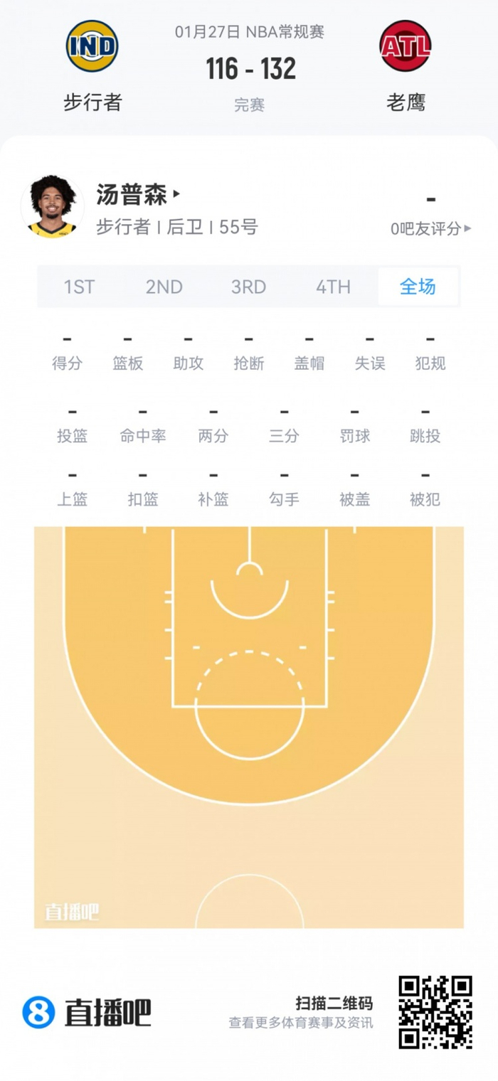 步行者落选秀伊桑·汤普森 登场1.4分钟