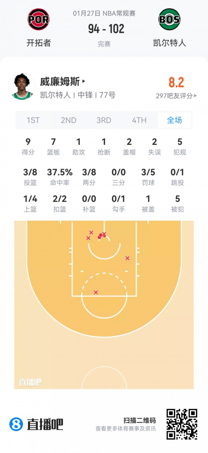 凯尔特人次轮46号秀阿马里·威廉姆斯 登场25.9分钟