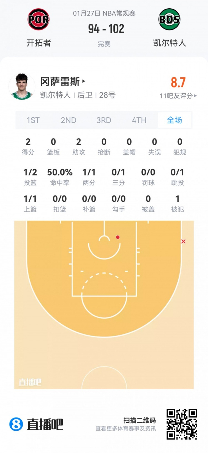 凯尔特人首轮28号秀冈萨雷斯 登场14.2分钟