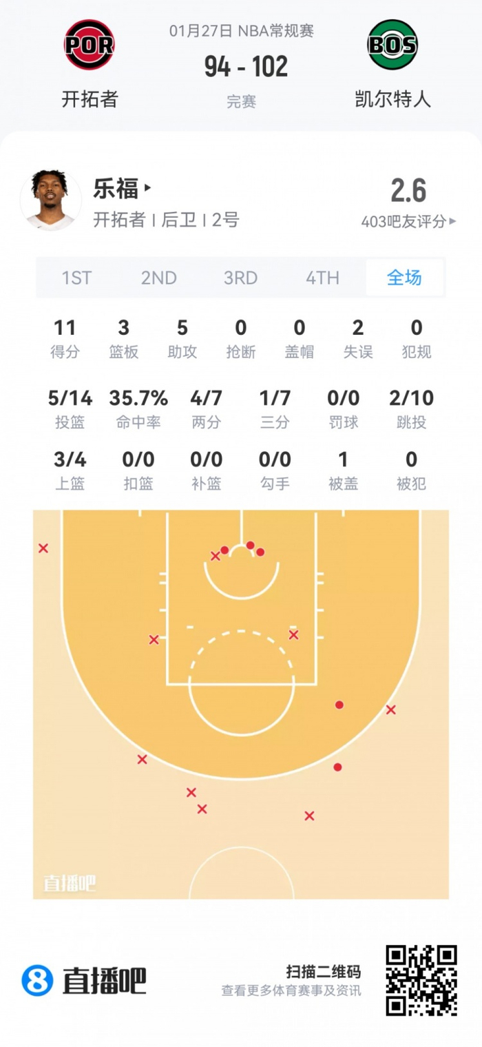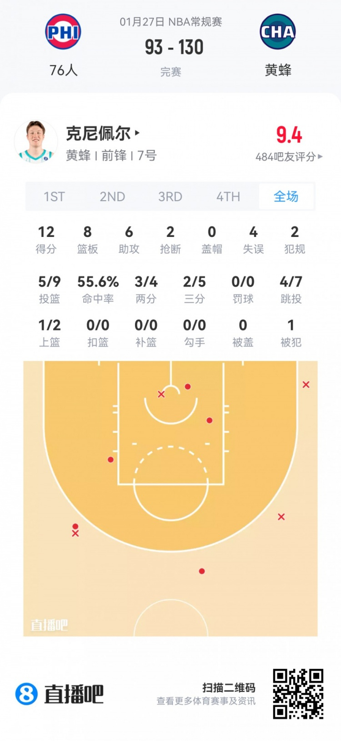【菜鸟】杨瀚森DNP 克尼佩尔12分8板6助2断 乐福14投11分三分7中1