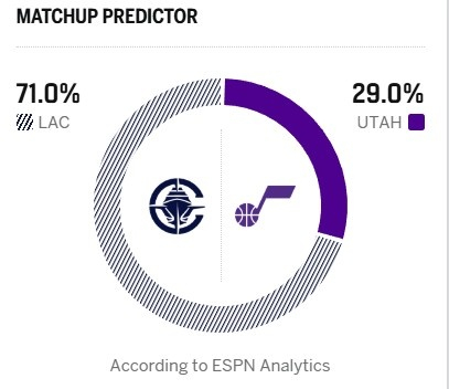 继续北伐?ESPN明日胜率预测:快船高达71.0% 爵士为29.0%