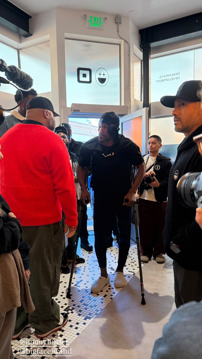 Guru写道:“吉米·巴特勒在BigFace开幕街区派对上亮相,这是他自遭遇右膝前十字韧带撕裂以来的首次公开露面。”