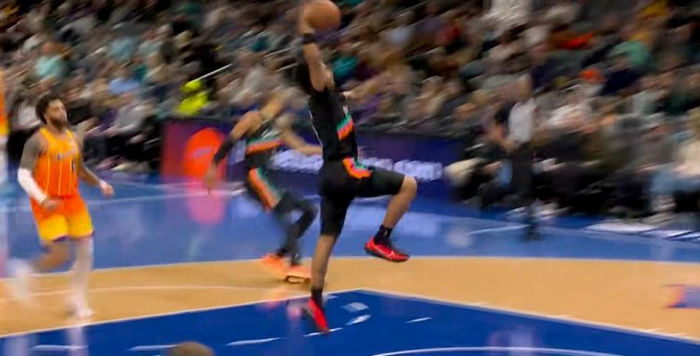 防守端铜墙铁壁进攻端风驰电掣!马刺完成抢断哈珀反击滑翔飞扣!