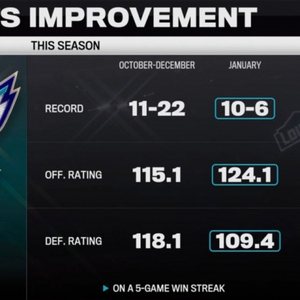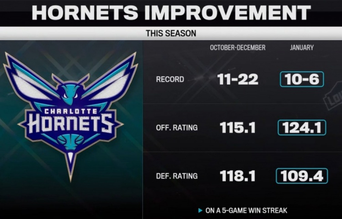 黄蜂本赛季1月和前3月对比!攻防效率均提升9左右 胜率翻一倍