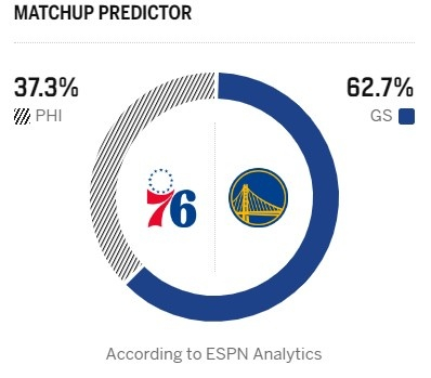 库里缺席!ESPN预测明日胜率:76人仅为37.3% 勇士62.7%